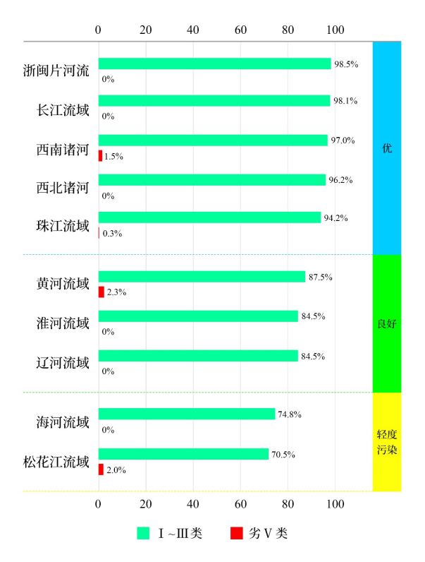 1-12月,长江、黄河、珠江、松花江、淮河、海河、辽河等七大流域及西北诸河、西南诸河和浙闽片河流水质优良(Ⅰ-Ⅲ类)断面比例为90.2%,同比上升3.2个百分点;劣Ⅴ类断面比例为0.4%,同比下降0.5个百分点。主要污染指标为化学需氧量、高锰酸盐指数和总磷。其中,浙闽片河流、长江流域、西南诸河、西北诸河和珠江流域水质为优;黄河、淮河和辽河流域水质良好;海河和松花江流域为轻度污染。