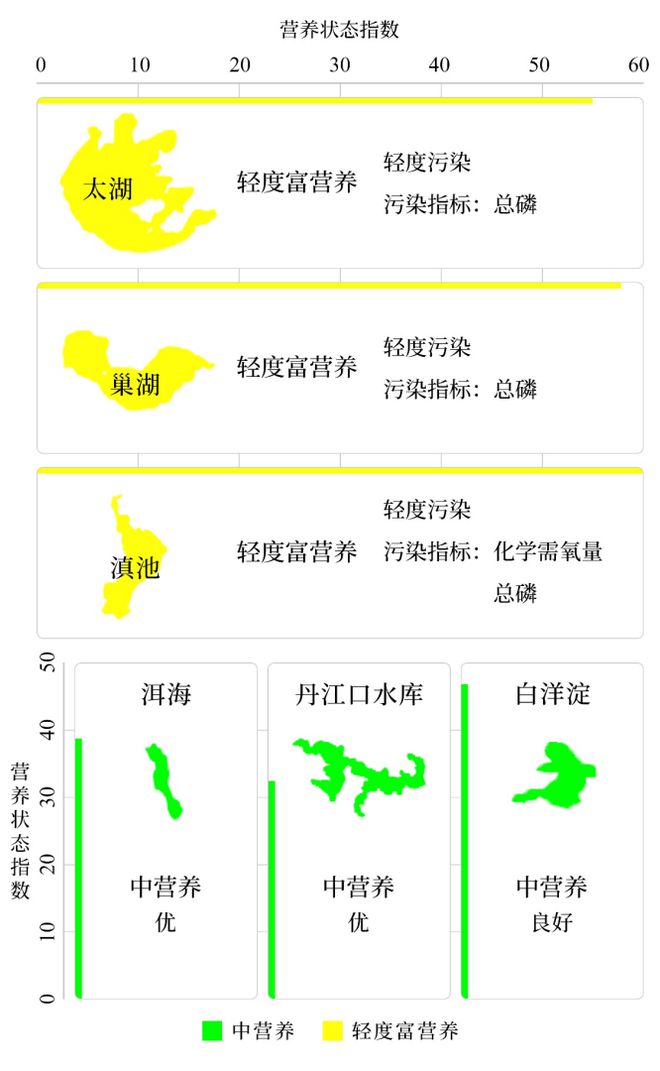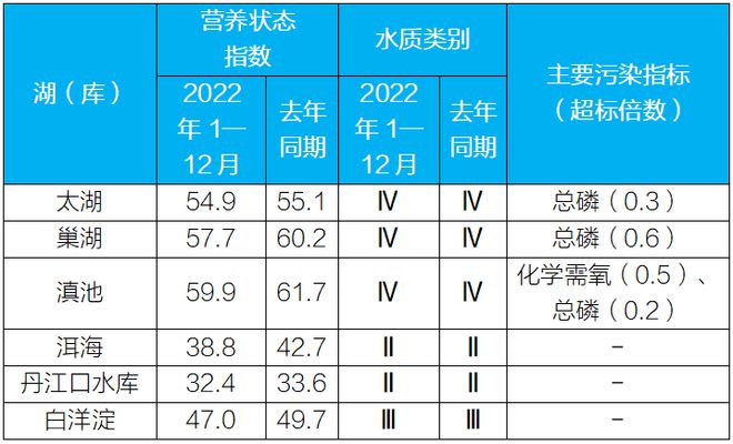 1-12月,监测的210个重点湖(库)中,水质优良(Ⅰ—Ⅲ类)湖库个数占比73.8%,同比上升0.9个百分点;劣Ⅴ类水质湖库个数占比4.8%,同比下降0.4个百分点。主要污染指标为总磷、化学需氧量和高锰酸盐指数。204个监测营养状态的湖(库)中,中度富营养的12个,占5.9%;轻度富营养的49个,占24.0%;其余湖(库)为中营养或贫营养状态。其中,太湖和巢湖均为轻度污染、轻度富营养,主要污染指标为总磷;滇池为轻度污染、轻度富营养,主要污染指标为化学需氧量和总磷;洱海和丹江口水库水质均为优、中营养;白洋淀水质良好、中营养。