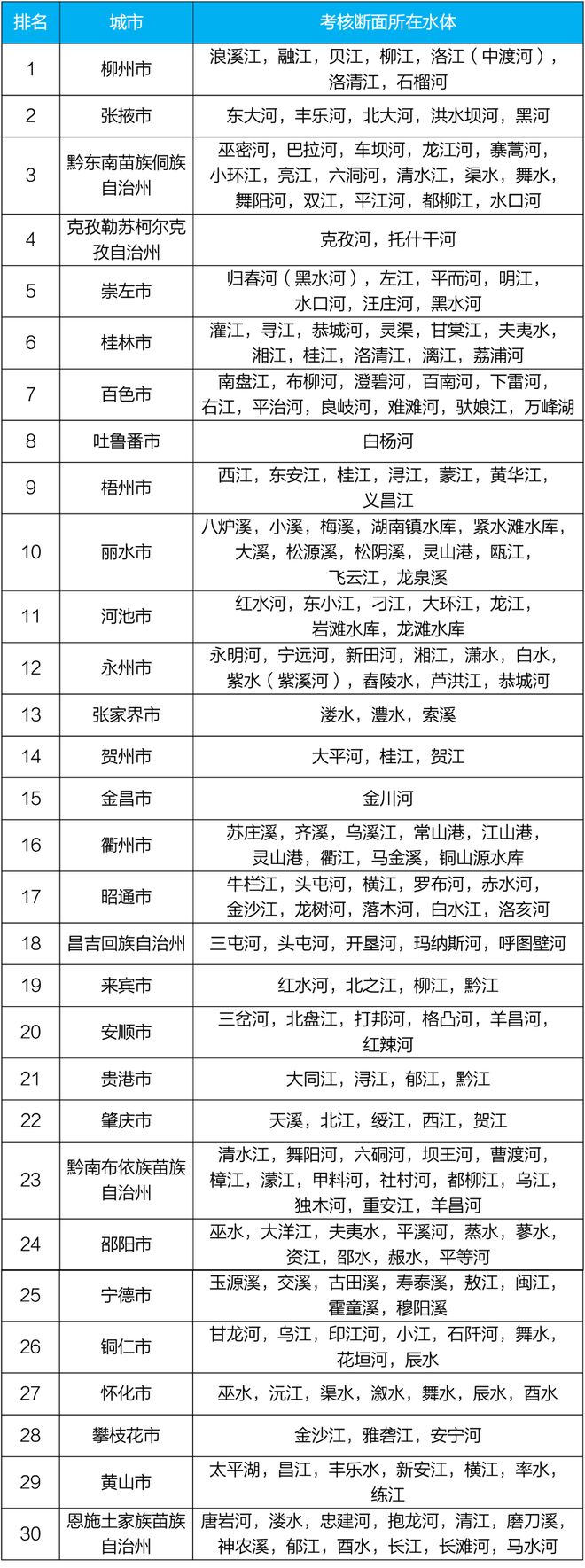 1-12月,全国地级及以上城市中,柳州、张掖和黔东南等30个城市国家地表水考核断面水环境质量相对较好(从第1名至第30名),白城、五家渠和石河子等30个城市国家地表水考核断面水环境质量相对较差(从倒数第1名至倒数第30名),见附表1—附表2。