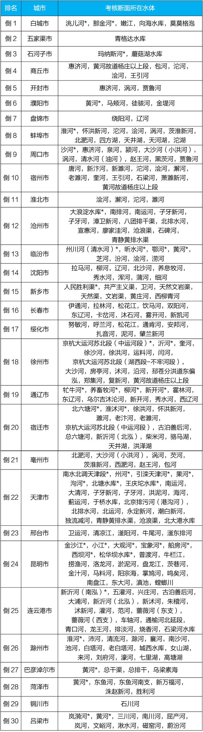 地级及以上城市国家地表水考核断面排名