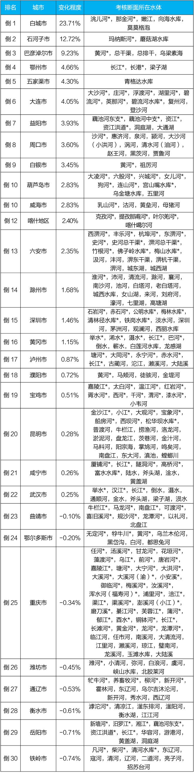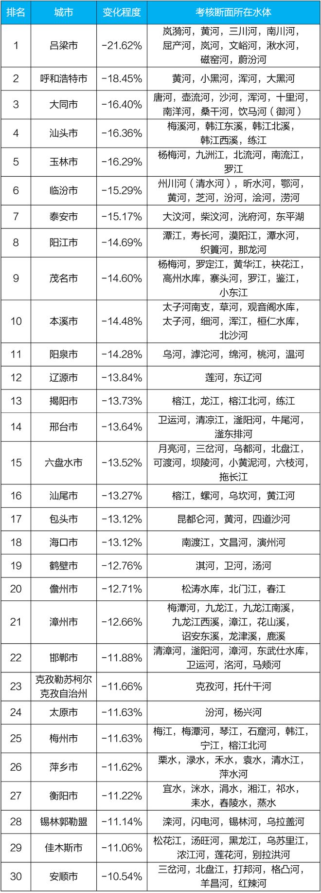 吕梁、呼和浩特和大同等30个城市国家地表水考核断面水环境质量变化情况相对较好(从第1名至第30名),白城、石河子和巴彦淖尔等30个城市国家地表水考核断面水环境质量变化情况相对较差(从倒数第1名至倒数第30名),见附表3—附表4。
